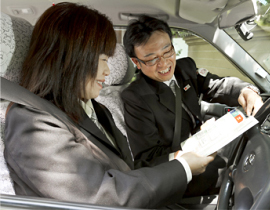 次に研修制度について東京の地理はなじみがなく、不安ばかりでしたが、入社後のマンツーマンの研修ですぐに安心に変わります。特に地理では、目印になる看板や街路樹、建物の覚え方、駅での車のつけ方など、同乗してもらい、本当に丁寧に教えてくれました。研修日数が多く設けてあるので焦らずできました。